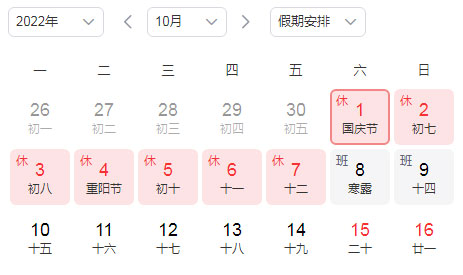 2022年国庆节放假时间为:10月1日至7日放假调休,共7天。其中10月8日(星期六)、10月9日(星期日)调休上班。